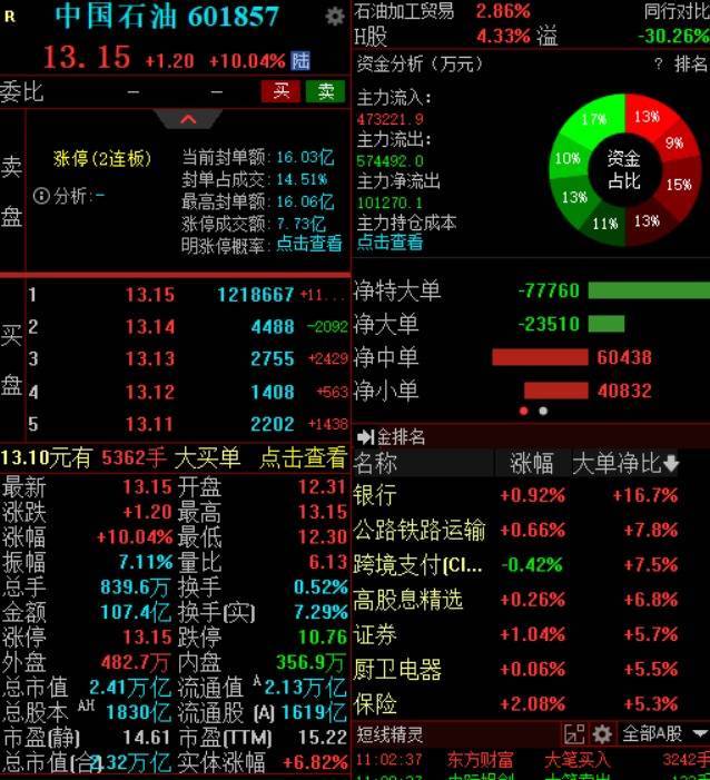 油气板块成为本日亮点,盘初抓续走强,准油股份、洲际油气等多只个股涨停。中国石油A股再度涨停(2连板),成交额打破100亿元,显现资金活跃度飞扬。