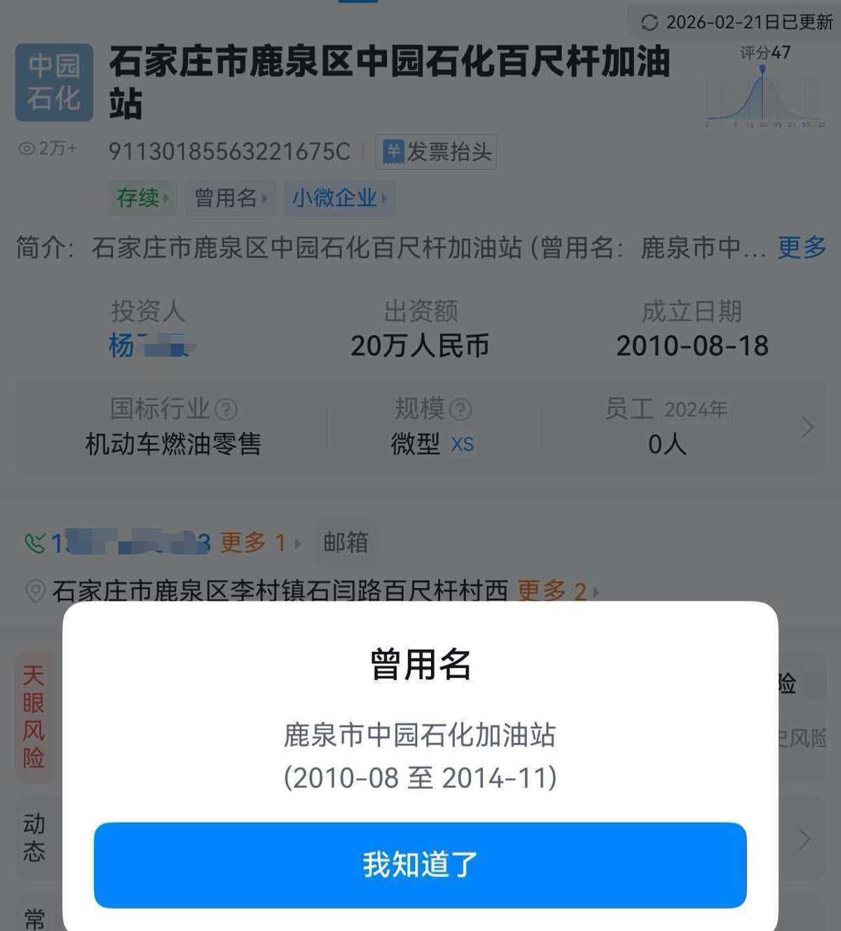 不外,记者查询天眼查流露,该加油站2010年拓荒时的名字为“鹿泉市中园石化加油站”,2014年依然改为了“石家庄市鹿泉区中园石化百尺杆加油站”。