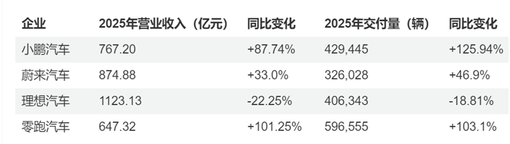 小鹏和零跑是2025年营收增长最快的两家企业,同比增幅永别达到87.74%和101.25%,但盈利智商出现分化。