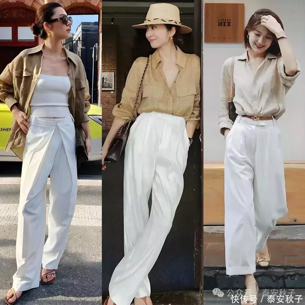 秋季里,衬衫与白色阔腿裤的组合,锐利常经典又多礼的。