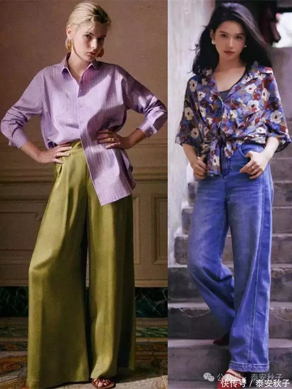在这个成绩的季节里,如果你还念念用衬衫+阔腿裤的组合,穿出优雅女东谈主味?那就将詈骂色系的裤子换成和缓灵动的彩色系吧。