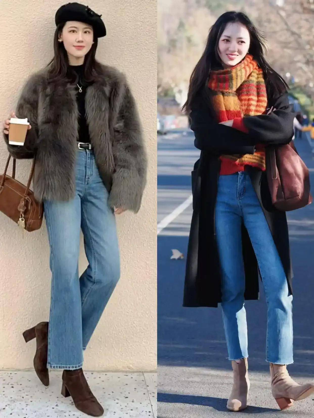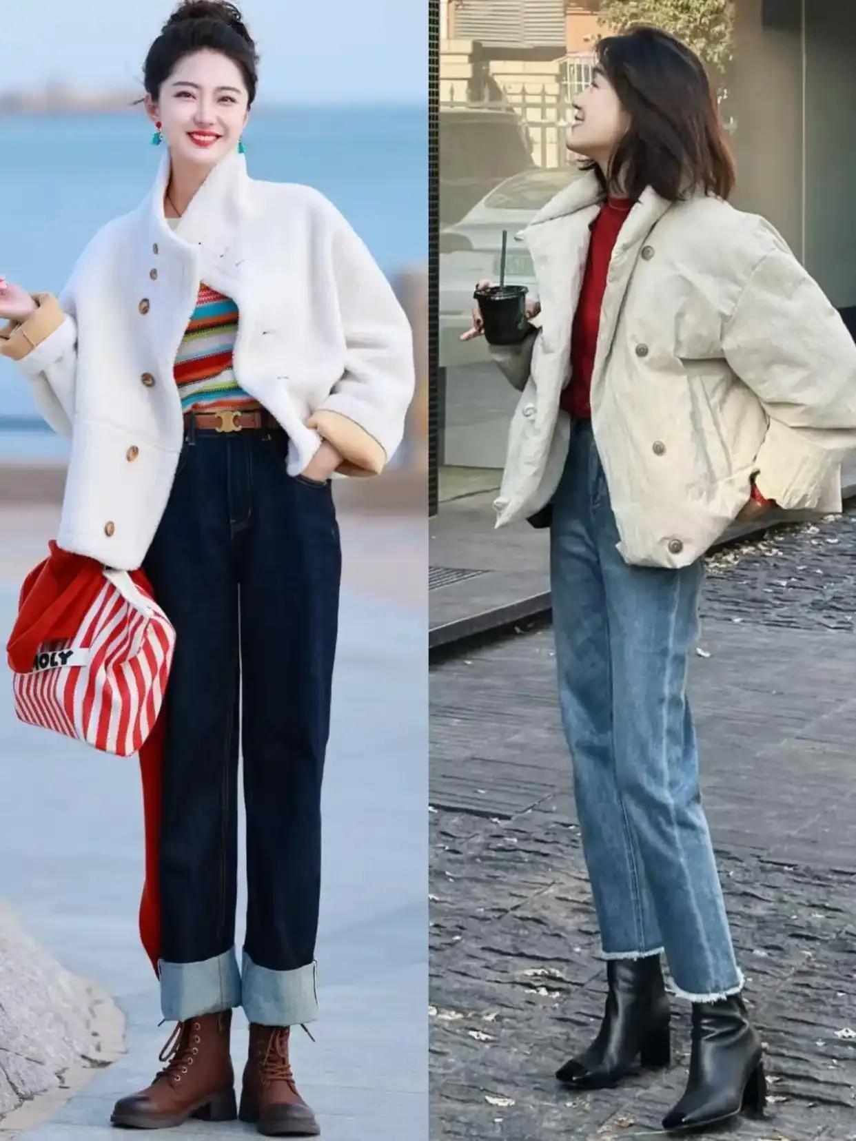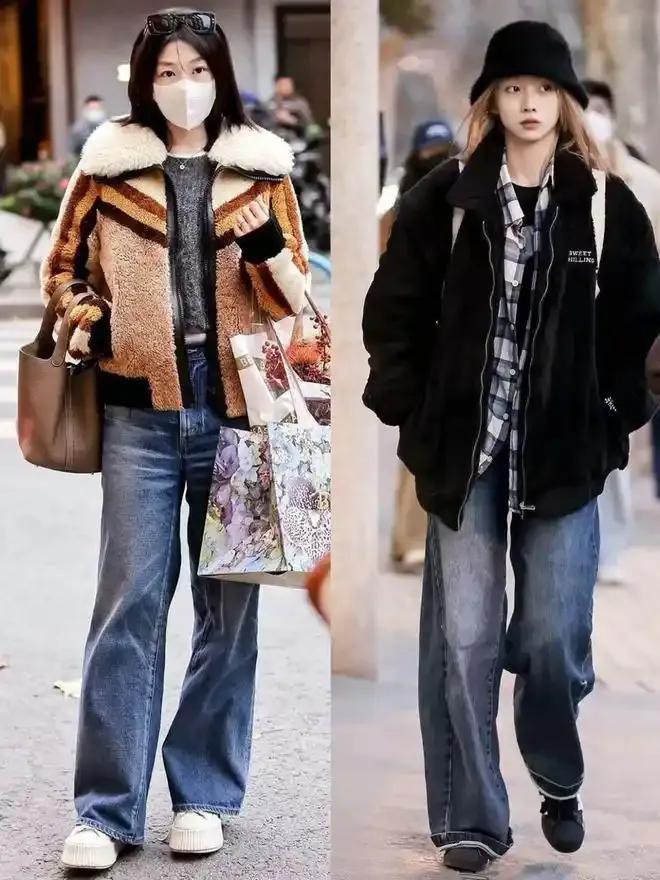 ②牛仔裤+羊羔毛外衣,清闲又斯文