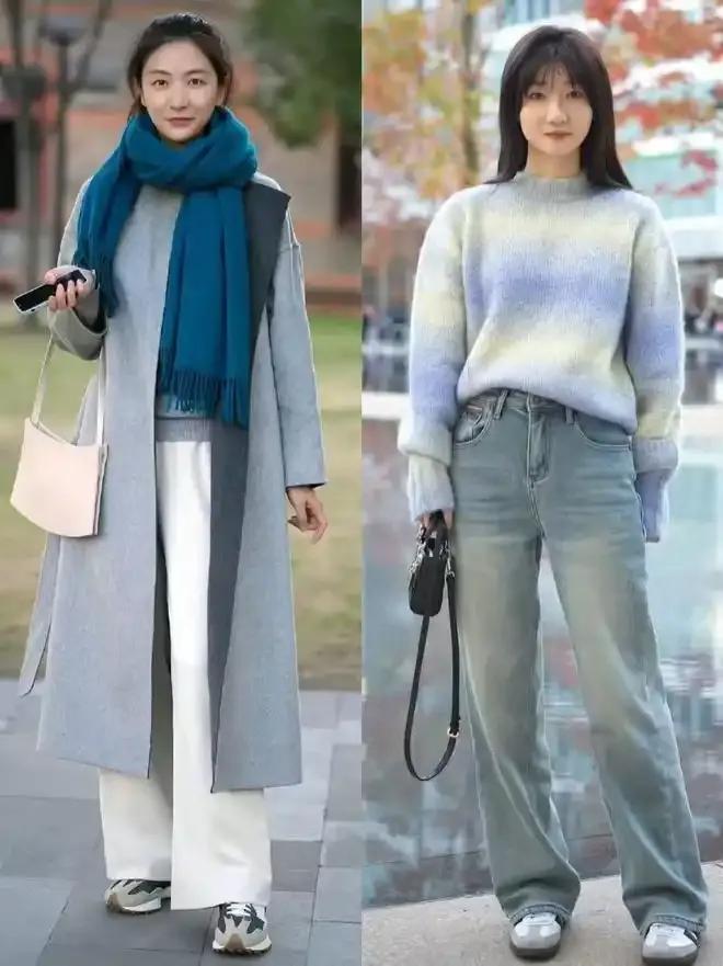 上头左边的这一套穿搭,平直用灰色的大衣内搭灰色的真挚毛衣,加上白色的直筒阔腿裤,脚上穿的一对老爹鞋,再用一条经典的绿色领巾来搭配,这样的搭配经典又斯文。